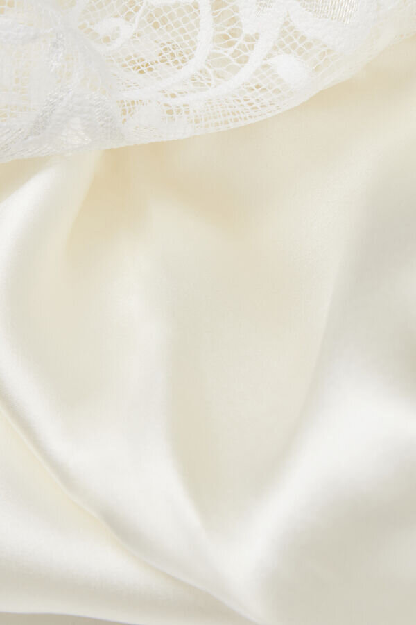 μακρύ νυχτικό από μεταξωτό σατέν, διακοσμημένο με δαντελένια βολάν στο πίσω μέρος και στα πλάγια του μπούστου. αισθησιακές πλαϊνές σχισμές. (175 cm) και φοράει μέγεθος 2 / s