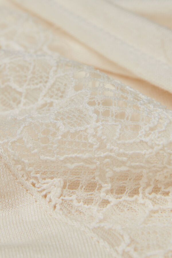 κορμάκι από απαλό, εξαιρετικά ελαφρύ μείγμα μοντάλ και κασμίρ, διακοσμημένο με δαντελένιο βολάν στο ντεκολτέ. Ζεστό και άνετο, είναι ιδανικό για να φορεθεί μόνο του ή κάτω από ένα σακάκι. Το ελαφρώς διαφανές αποτέλεσμα το κάνει πολύ θηλυκό.
