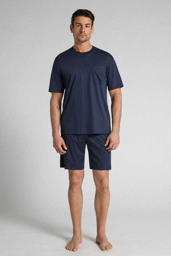 κοντές πιτζάμες με μαλακό, μονόχρωμο πουκάμισο από βαμβάκι υψηλής ποιότητας με τσέπη με μοτίβο κουκκίδων. Τα σορτς έχουν επίσης τυπωμένο μοτίβο κουκκίδων.