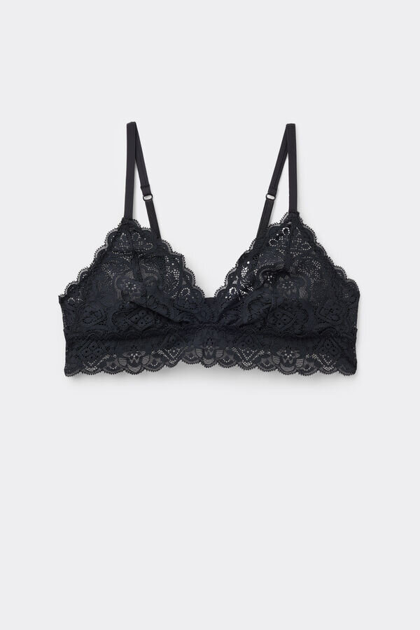 τρίγωνο σουτιέν Emma από απαλή ελαστική δαντέλα. εσωτερική επένδυση από μικροΐνες που καλύπτεται από δαντελένιο βολάν, δημιουργώντας ένα εφέ bralette. δαντελένια λεπτομέρεια στο πλάι των κυπέλλων. ρομαντικό και θηλυκό στυλ.